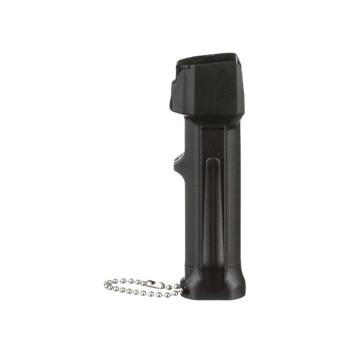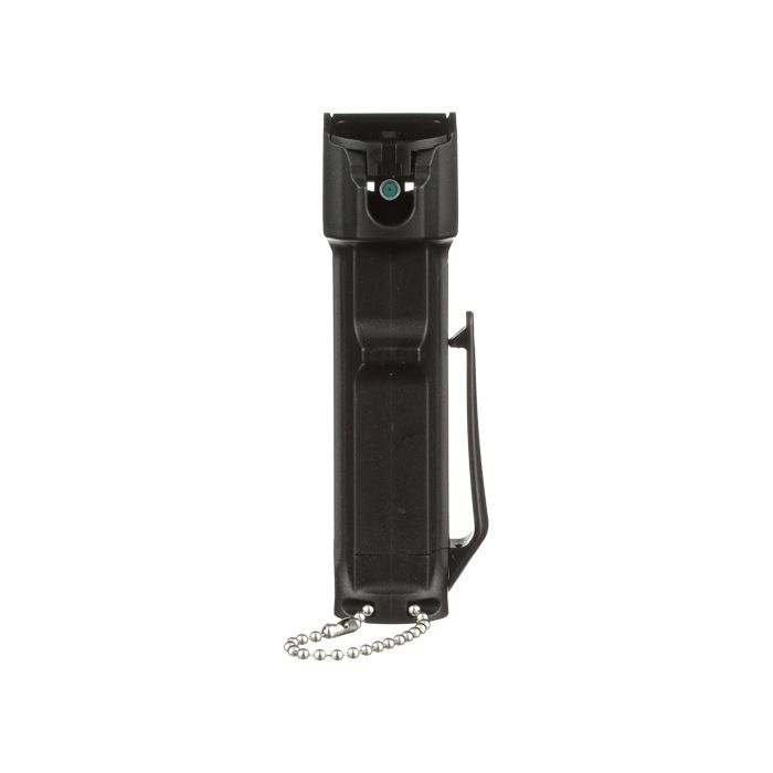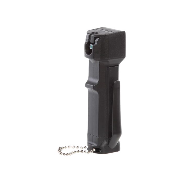 Safety features include a flip-top safety cap that prevents accidental discharge, a finger-grip dispenser for more accurate aim and built in belt clip and keychain for easy access.