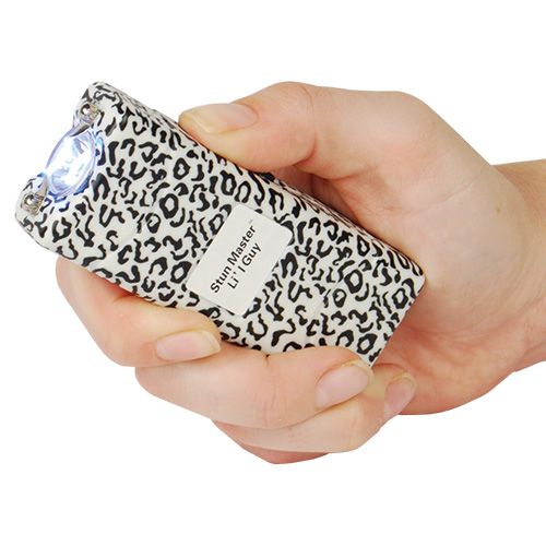 Stun Master Lil Guy 60,000,000 volts Stun Gun W/flashlight and Nylon Holster Animal print. This little stun gun is small and compact with 4.4 milliamps depending on the freshness of the batteries. It has a super bright LED flashlight built in charger and comes with a nylon case. It measures only 3 3/4″ x 1 1/2″ x 3/4″. Don’t’ let the name Stun Master Lil Guy fool you. It has a beast inside just waiting to be released. Just press the shock button and the Lil Guy thrashes 60,000,000 volts out of the metal probes. The safety switch is off when in the down position, middle position is the super bright LED flashlight, and in the up position the shock is turned on once the trigger is pressed. Available in 6 colors Black, Pink, Purple, Red, Blue, and Animal Print.