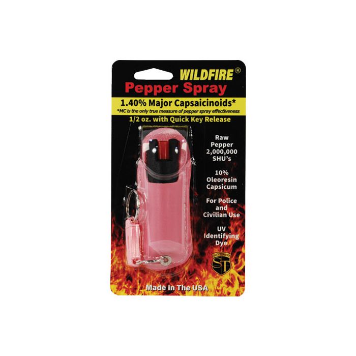 - Wildfire 1/2 oz. Pepper Spray has a range of 6-8 feet and comes with a leatherette halo holster.