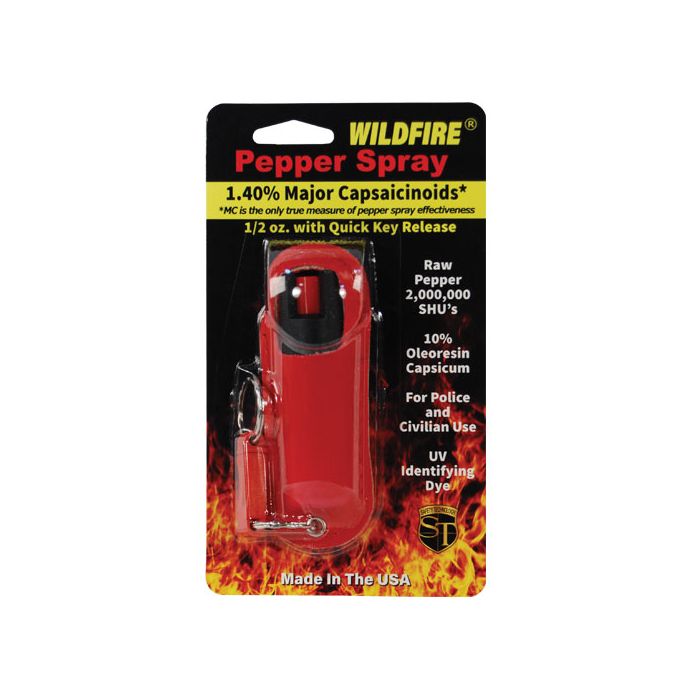 - Wildfire 1/2 oz. Pepper Spray has a range of 6-8 feet and comes with a leatherette halo holster.