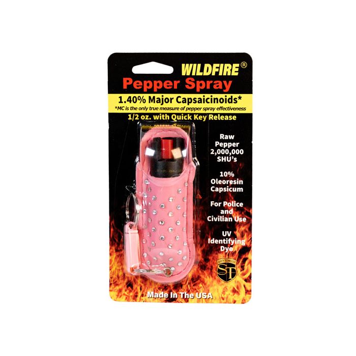 • Wildfire 1/2 oz. Pepper Spray has a range of 6-8 feet and comes with a leatherette halo rhinestone holster.