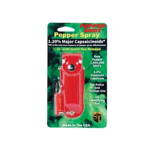 Pepper Shot 1.2% MC 1/2 oz pepper spray leatherette holster and quick release keychain Red