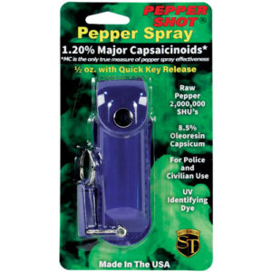 Pepper Shot 1.2% MC 1/2 oz pepper spray leatherette holster and quick release keychain blue