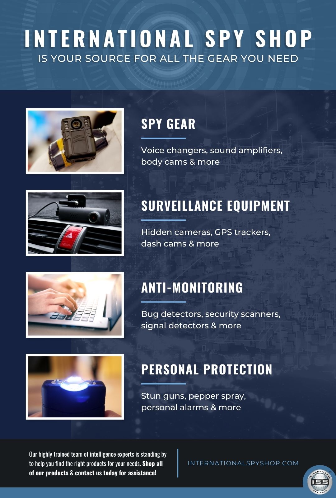 If you’re looking for spy gear, anti-monitoring equipment, or personal protection products, you’ve come to the right place. International Spy Shop is your one-stop source for all of your most demanding surveillance and counter-surveillance needs. We know that finding the right spy gear can be a daunting task. That’s why we have a team of highly trained experts who can help you find the perfect products for your precise applications. Whether you need hidden cameras, sound amplifiers, bug detectors, or anything else, we have you covered.